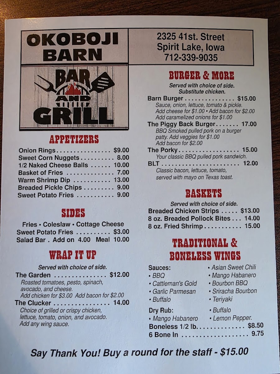 Bringing the meal to a satisfying close, the menu at Okoboji Barn Bar & Grill comes together as a comfortable blend of hearty Midwestern staples and casual bar-and-grill favorites, all presented with the kind of unfussy charm that suits its laid-back setting in Spirit Lake. The selection balances familiar comfort foods with approachable variations, offering generous portions that highlight the restaurant’s focus on warmth and consistency rather than over-complication. Alongside the mains, the beverage list adds an easygoing touch, especially with options like Modelo, which pair naturally with the menu’s savory, crowd-pleasing flavors. Overall, the offerings feel cohesive and dependable, making the menu a fitting reflection of the relaxed, welcoming atmosphere that defines the experience.